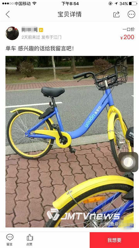 市民 黃小姐 (電話采訪):“昨天晚上八點(diǎn)多,在閑魚上面看江門本地的東西??吹接腥嗽陂e魚上發(fā)布一條信息,照片是兩輛共享單車,標(biāo)題是‘單車,有意請(qǐng)聯(lián)系’,還標(biāo)價(jià)200元?!?/p>