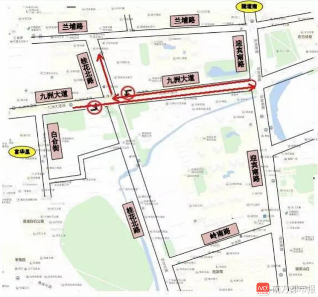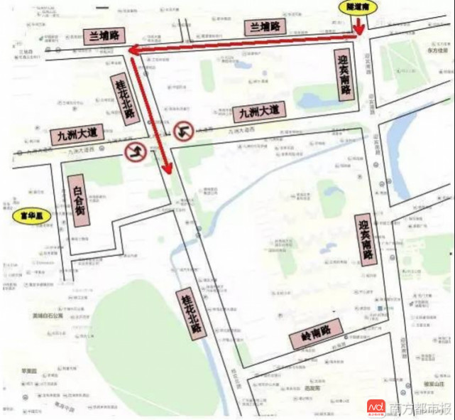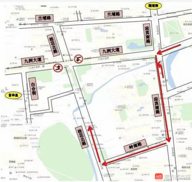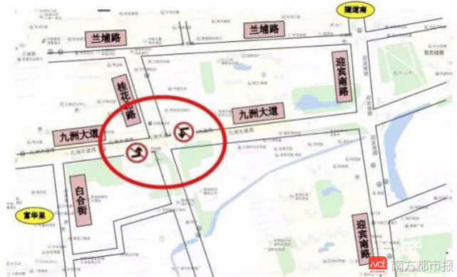 隧道南來車:可以選擇在迎賓南路提前右轉(zhuǎn)進(jìn)入蘭埔路,隨后再左轉(zhuǎn)進(jìn)入桂花北路,直行通過九洲大道交桂花北路路口。