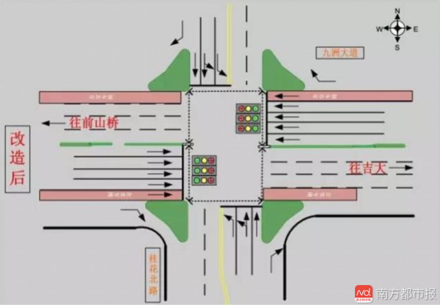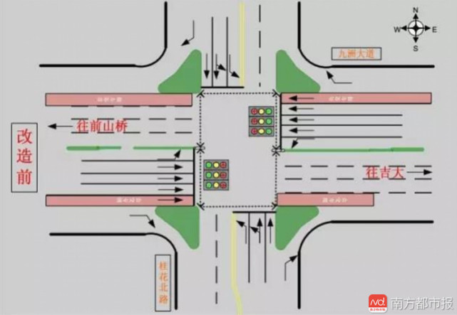 這個(gè)路口禁止左轉(zhuǎn)以后,本來用于左轉(zhuǎn)的時(shí)間就可以分配給九洲大道東西向直行車輛以及桂花北路左轉(zhuǎn)進(jìn)入九洲大道的車輛,橫過馬路的行人也會因此有更多的過馬路時(shí)間,路口整體的通行效率得以提高。