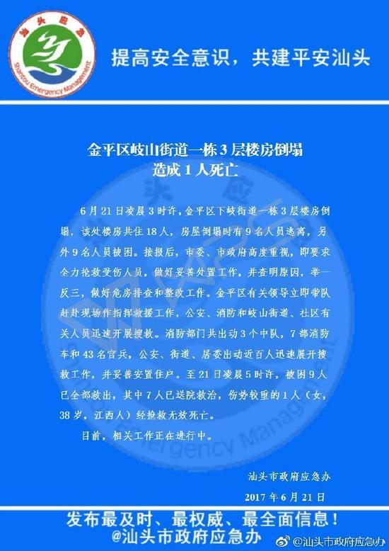 6月21日凌晨3時許,金平區(qū)下岐街道一棟3層樓房倒塌,該處樓房共住18人,房屋倒塌時有9名人員逃離,另外9名人員被困。接報后,市委、市政府高度重視,即要求全力搶救受傷人員,做好妥善處置工作,并查明原因,舉一反三,做好危房排查和整改工作。金平區(qū)有關(guān)領(lǐng)導(dǎo)立即帶隊趕赴現(xiàn)場作指揮救援工作,公安、消防和岐山街道、社區(qū)有關(guān)人員迅速開展搜救。消防部門共出動3個中隊,7部消防車和43名官兵,公安、街道、居委出動近百人迅速展開搜救工作,并妥善安置住戶。至21日凌晨5時許,被困9人已全部救出,其中7人已送院救治,傷勢較重的1人(女,38歲,江西人)經(jīng)搶救無效死亡。目前,相關(guān)工作正在進行中。