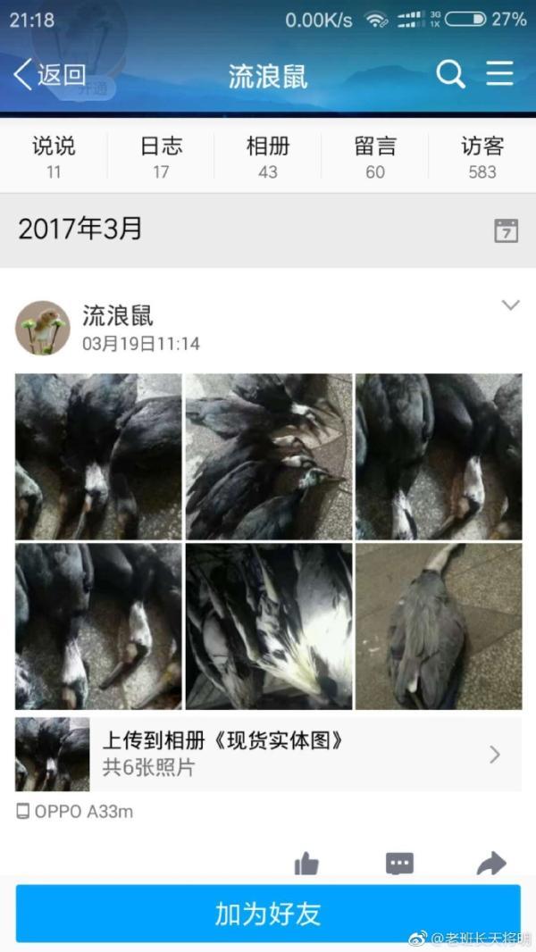 此前的11月4日,網(wǎng)友@老班長天將明在網(wǎng)絡上向國家林業(yè)局提供線索,稱有人大量收購販賣鳥類,包括夜鷺、蒼鷺、鸕鶿等,并涉及猛禽等重點保護動物,并且提供了截圖證據(jù)、販賣者手機、微信、QQ號等信息。