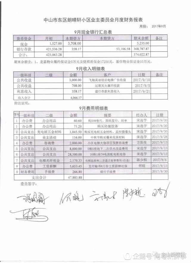 導(dǎo)讀:11月11日,中山東區(qū)朗晴軒小區(qū)業(yè)委會官號公布了2017年第3季度財務(wù)報表,從報表中可見,該小區(qū)業(yè)主每個月的集體收入有三四萬元,截至9月份,小區(qū)業(yè)主集體的存款將近40萬元。一個小區(qū),業(yè)主集體的存款將近40萬元,這吸引了“南粵新鮮