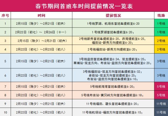 其中,2月11日(農歷廿六)、12日(農歷廿七)節(jié)前兩天,2月 20日(正月初五)、21日(正月初六)、22日(正月初七)節(jié)后三天,深圳地鐵全網將延長運營到24:00。