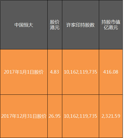 如果說李嘉誠是穩(wěn)中求進(jìn),許家印則堪稱是放了超級衛(wèi)星。2017年1月1日的時候,許家印持有中國恒大的市值不過416億港元,到2017年12月31日的時候,已經(jīng)狂漲了4.5倍,達(dá)到2321億港元。如下圖: