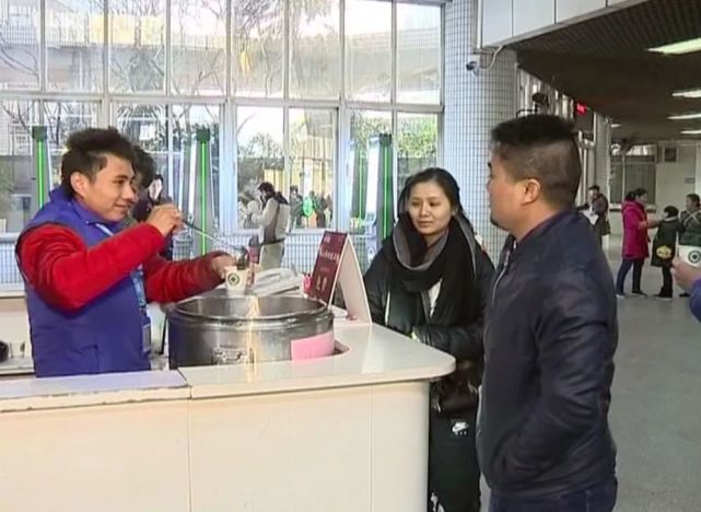今天的最高氣溫只有14攝氏度,佛山火車站的便民服務點為市民送上姜茶和免費電話服務。