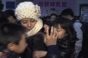 同樣在火車站,梅女士“一拖二”帶著兩個小孩回家。被問及是否辛苦時,她笑笑道:“是很幸福的,我兩個小孩都很乖,大的可以照顧小的。”