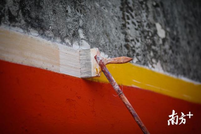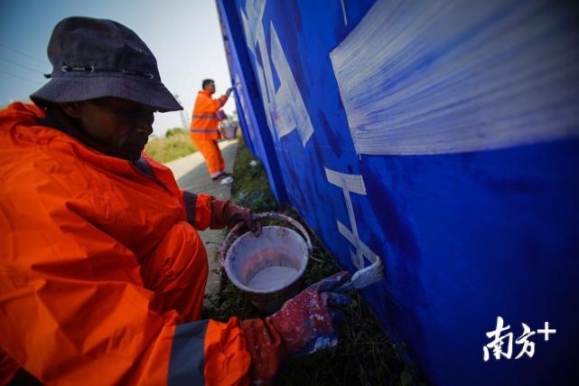 黃福強(qiáng)用藍(lán)色的顏料將原來的廣告內(nèi)容覆蓋掉,這個(gè)過程叫作“鋪底”。墻上油漆風(fēng)干后,黃興祥開始寫廣告標(biāo)語。橫豎撇捺,十五秒左右,黃興祥在墻上完成了一個(gè)標(biāo)準(zhǔn)等線字體,整段標(biāo)語的字體間距也保持了整齊劃一。這門手藝黃興祥用了接近30年。