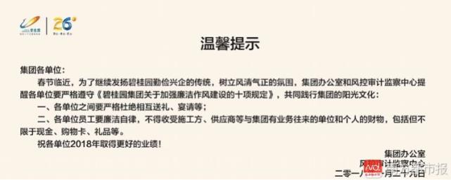 據(jù)集團(tuán)內(nèi)部員工透露,碧桂園年前專門發(fā)出“溫馨提示”,要求各單位嚴(yán)格遵守《關(guān)于加強(qiáng)廉潔作風(fēng)建設(shè)的十項(xiàng)規(guī)定》,杜絕相互送禮,宴請等。記者登錄該集團(tuán)官網(wǎng)發(fā)現(xiàn),該“溫馨提示”就掛于官網(wǎng)首頁顯眼位置。