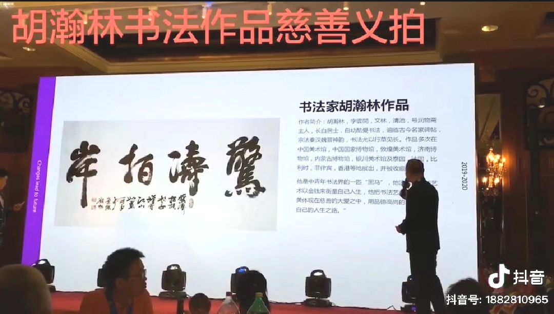 導(dǎo)讀: 8月26日,中國(guó)書法家協(xié)會(huì)會(huì)員、著名書法家胡瀚林在北京中航泊悅大酒店應(yīng)邀參加“心中有愛 行中有善”大型公益活動(dòng),活動(dòng)期間,胡瀚林為公益活動(dòng)捐贈(zèng)了書法作品,大愛無
